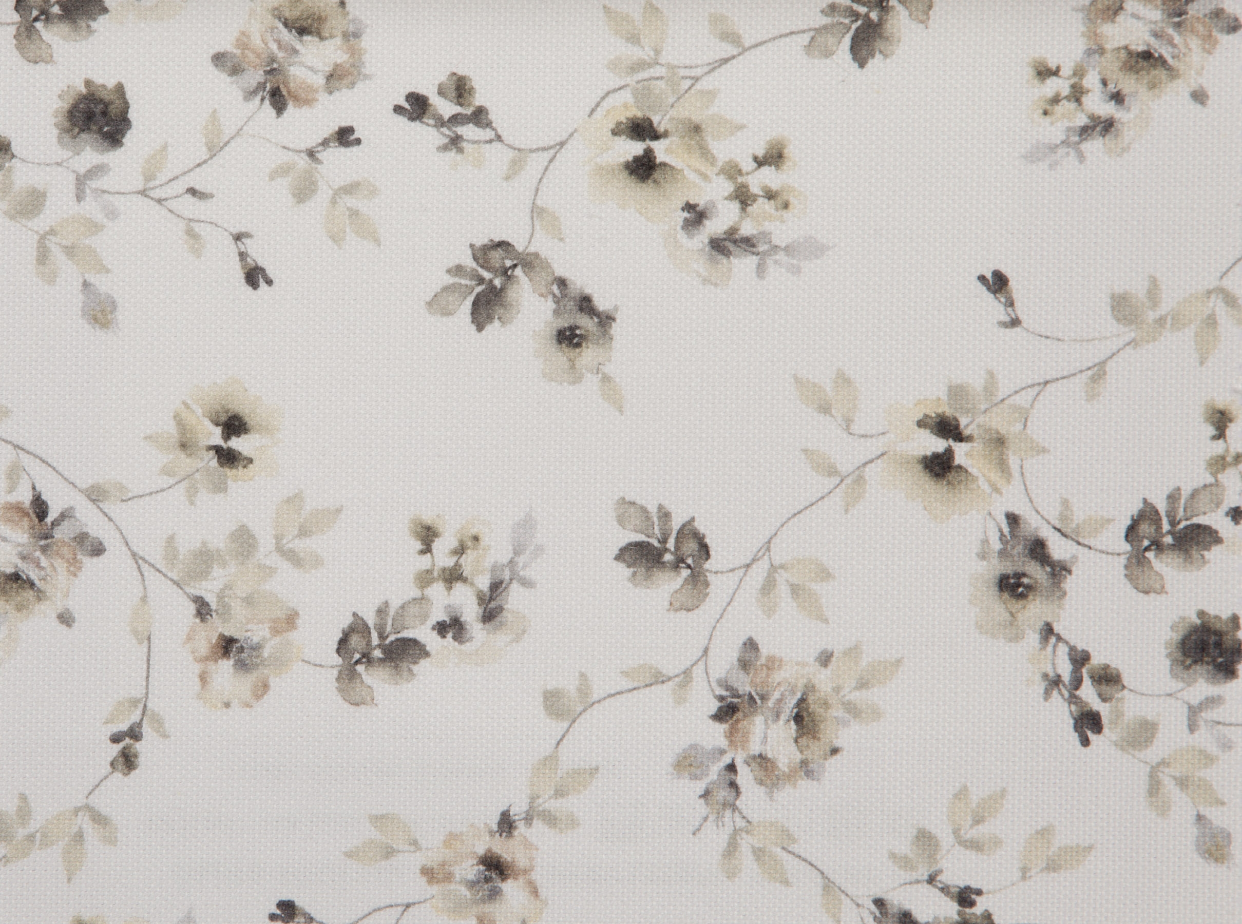 Ekskluzywna tkanina o wysokiej zawartości bawełny. Tkana na wzór płócienny, delikatna w dotyku. Na subtelnym , białym tle artystycznie ukazane drobne, delikatne kwiatki. Kolorystyka neutralna, biało szara, dająca duże możliwości kompozycyjne, jeżeli chodzi o dodatki. Tkanina idealna na zasłony, rolety, poduszki i szeroko pojęte artykuły dekoracyjne. Specjalny druk daje wrażenie ręcznie malowanych tkanin . Kolekcja (ze względu na różnorodność) bardzo uniwersalna, odnajdzie się w wielu stylach dekoratorskich, zarówno jako motyw wiodący, jak i przełamanie schematu.