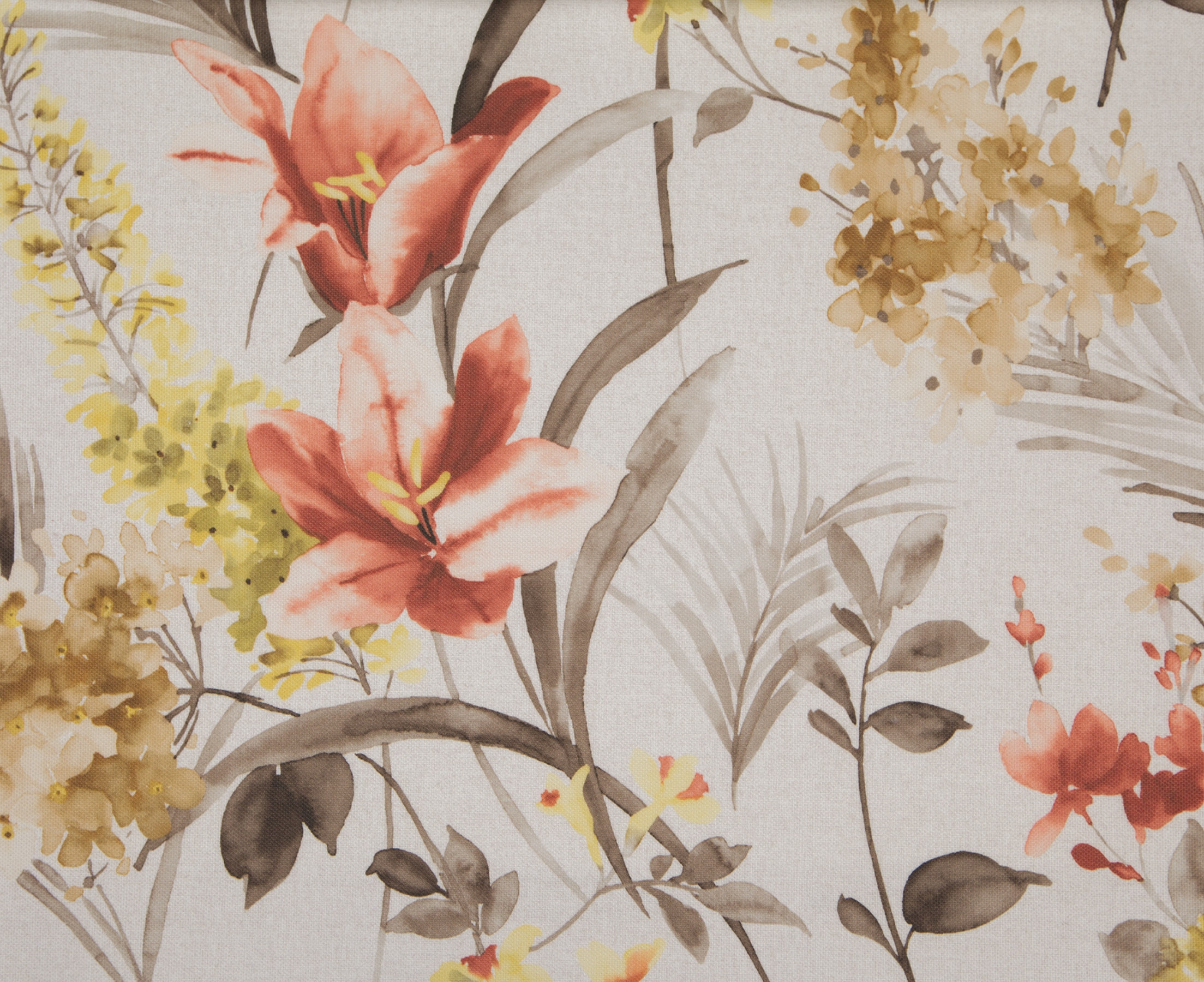 Ekskluzywna tkanina o wysokiej zawartości bawełny. Tkana na wzór płócienny, delikatna w dotyku. Na białym tle ukazane różnokolorowe, piękne kwiaty, przeplatane gałązkami i palmowymi liśćmi. Dość duży, wyraźny, akwarelistyczny, ale nie przytłaczający wzór. Kolorystyka bardzo ciepła, wachlarz kolorów od nasyconego pomarańczowego, poprzez żółcie i beże, aż do brązu. Specjalny druk daje wrażenie ręcznie malowanych tkanin. Tkanina idealna na zasłony, rolety, poduszki i szeroko pojęte artykuły dekoracyjne. Kolekcja (ze względu na różnorodność) bardzo uniwersalna, odnajdzie się w wielu stylach dekoratorskich, zarówno jako motyw wiodący, jak i przełamanie schematu.
